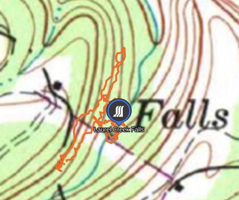 As we descend toward the creek, we notice landmarks mentioned in the guidebook: some sheer cliffs on the left, the remnants of an old out-building on the right. Surely the author didn’t just “forget” that he almost destroyed his vehicle driving to this point right? Anyway, we find the trailhead and follow an unmarked but well-trodden path to a spectacular view of Laurel Creek Falls. Another thing the guidebook failed to mention was exactly how impressive this waterfall is. We were both in awe of it, and spent some time taking photos here.