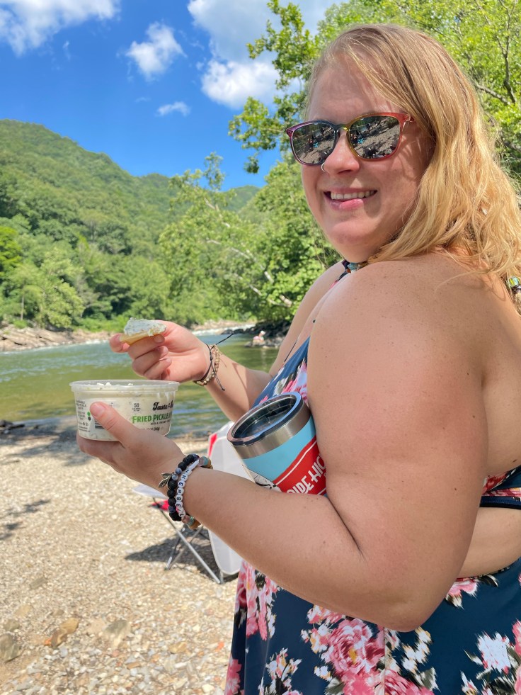 With the worst of the harrowing drive over, Eleni and I are proud of ourselves for surviving unscathed and getting ourselves and Wonda out of the woods in one piece. By this point, we’ve had enough of wrong turns and rough roads, so we leave the backwoods and head for the river, intent to spend the rest of the afternoon sunbathing, eating dill pickle dip, and watching rafters come down the New.