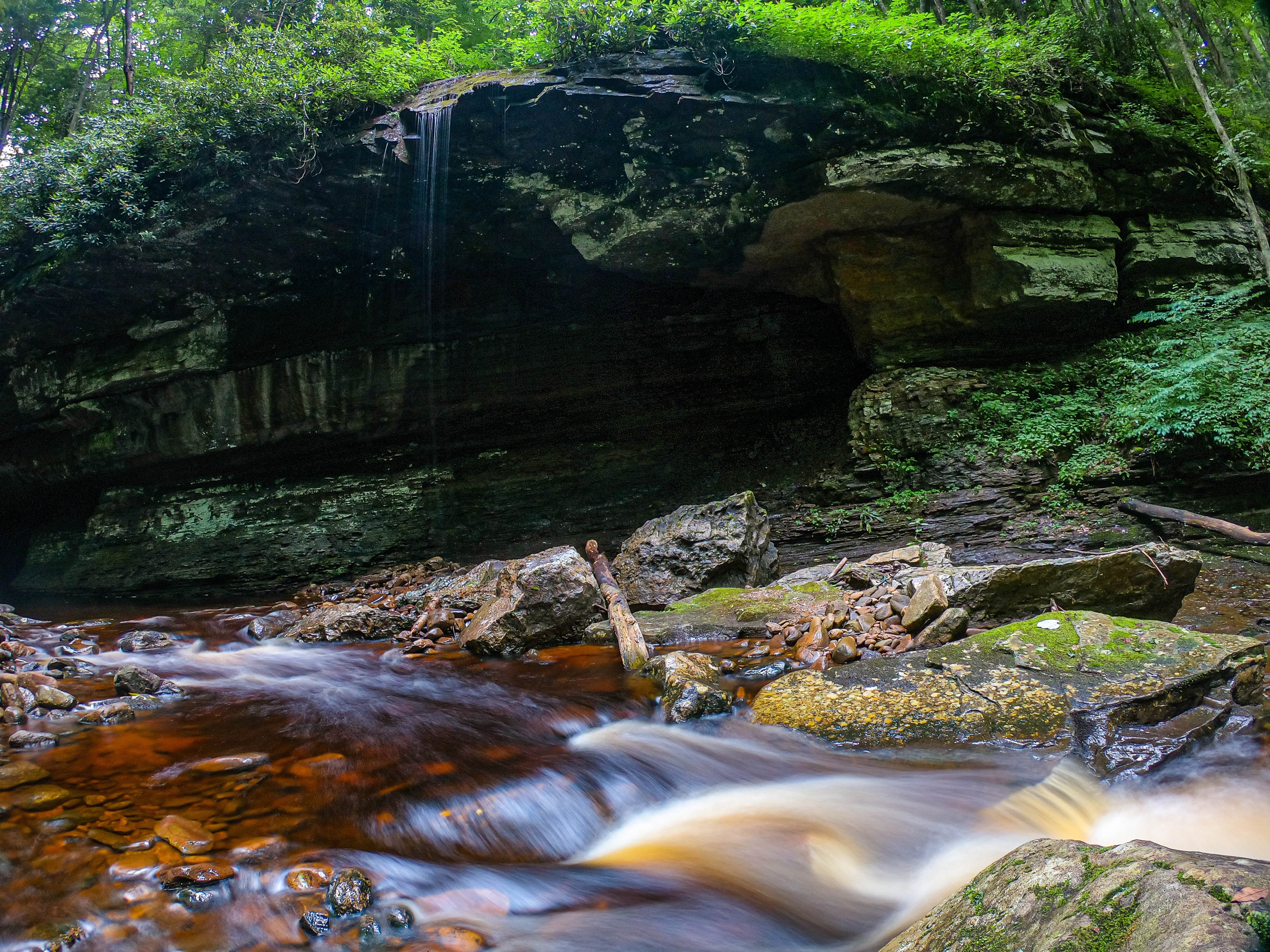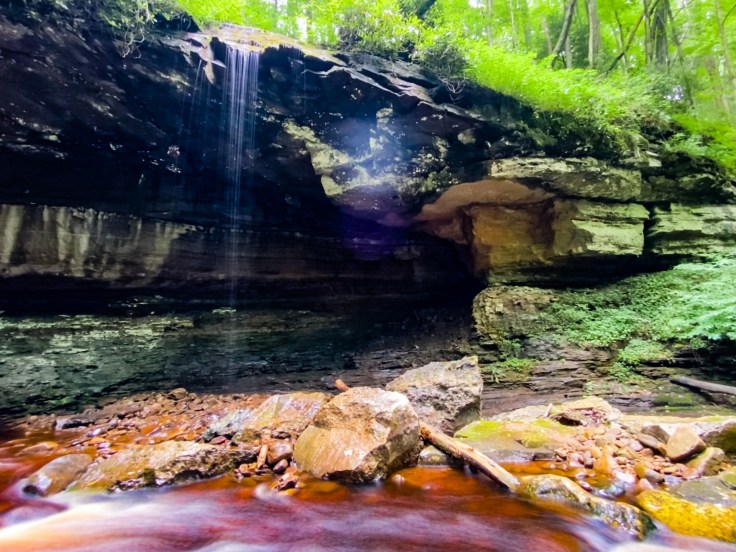 There are two waterfalls on this creek. One on Red Run Creek itself and one on a tributary flowing over a ledge and free-falling into Red Run. I had read that this waterfall needed high flow to look its best, and was hoping we would catch it running well after all the rain last night. We can hear the waterfall before we see it, and while it is running, it is nothing near as high-flow as I would have liked. Surprisingly, we run into two other women down at the creek. They pet Shooter and chat for a moment, asking if we’ve ever been here before. We haven’t of course. They move along and Amanda and I spend some time taking photos of the “Waterfall Downstream from Red Run Falls.”