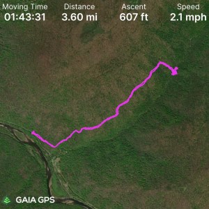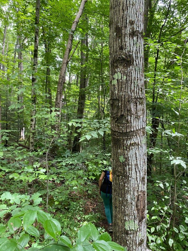 We safely reach the spot where old FR244 sharply and steeply joins Dry Fork Road. We park here and walk up the gravel forest road. Another note for anyone planning this hike: most cars could make it the first tenth of a mile up to where the road is gated, but there is only space for one, maybe two cars there and it’s a tight turn around. Most of this hike is on the gravel road beyond the gate, which is now closed to motor vehicle traffic. It’s an uneventful and rather boring hike until the point at which you leave the road, which is marked by a rather evil-looking “smiley face” on a tree. This is the landmark Amanda and I are watching for as we walk and chit-chat.