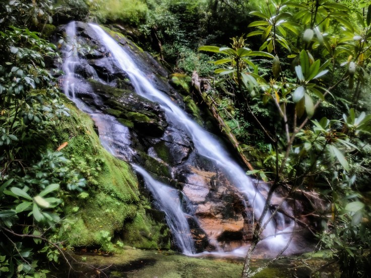 We all snap a few photos and ready ourselves for the clamber back down the mountain. About half a mile down we pass a large family with several small children. They ask how far it is, “to the top,” likely not realizing that though the Bartram Trail technically ends at Cheoah Bald (another 3 miles up), the trail ends at an intersection with the Appalachian Trail, and you can walk all the way to Maine if you’re so inclined. I ask them what their destination is, and they aren’t sure. So we just tell them they are about a half-mile from the waterfall, and another 3ish to Cheoah Bald. They make it clear they are only going to the waterfall and thank us for the information.