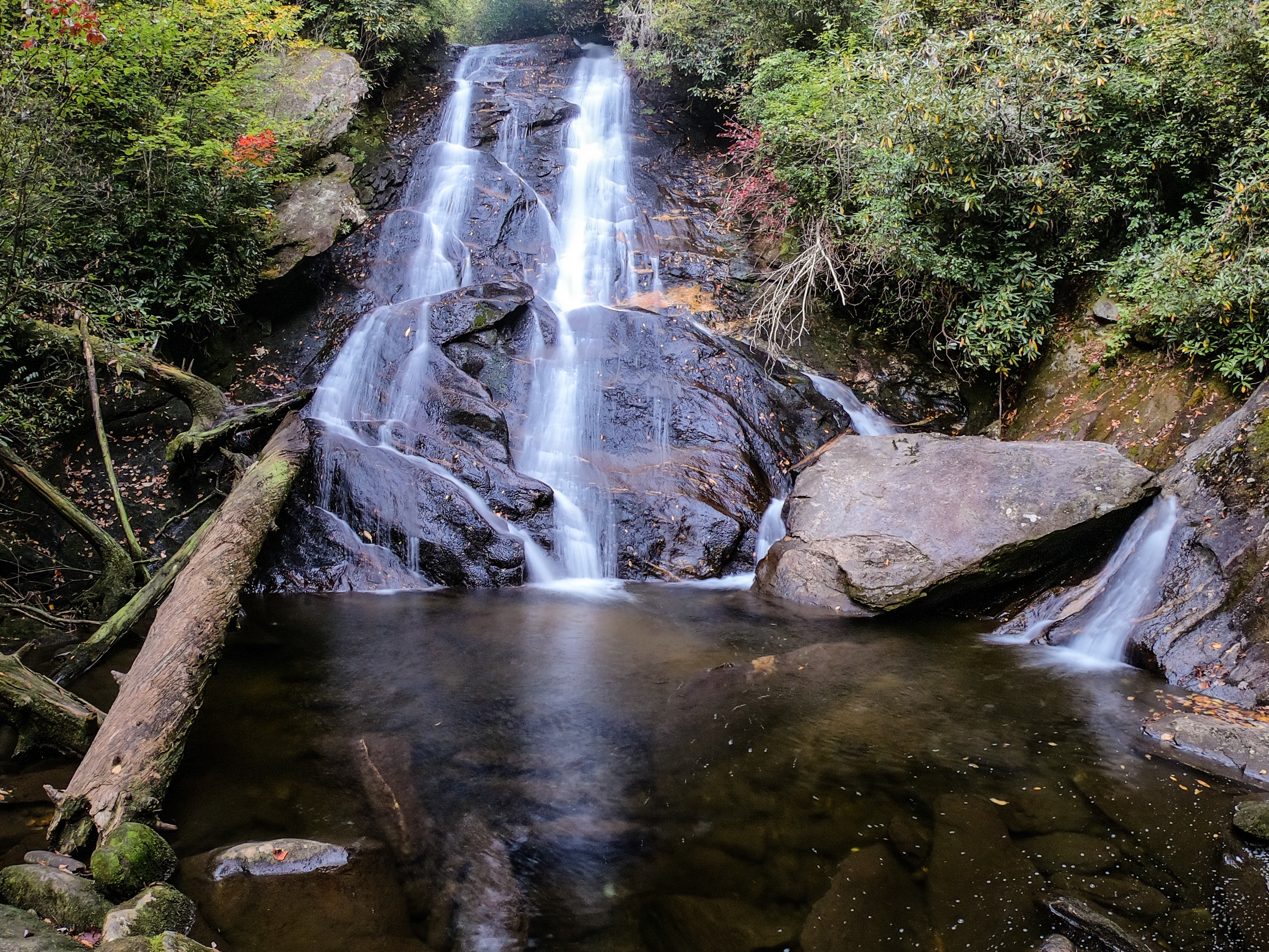 Reid Branch Falls is located on a short spur along the route to High Falls. We decide to hit it on the way back to ensure that we had enough time since Aby was on a time crunch to get back home. We end up having plenty of time so we decide to scramble down to it. Again, this isn’t a marked or maintained trail but it sees enough use that it is easy to follow, even if it is muddy and there are areas where you have to climb through and over tangles of rhododendron and downed trees.