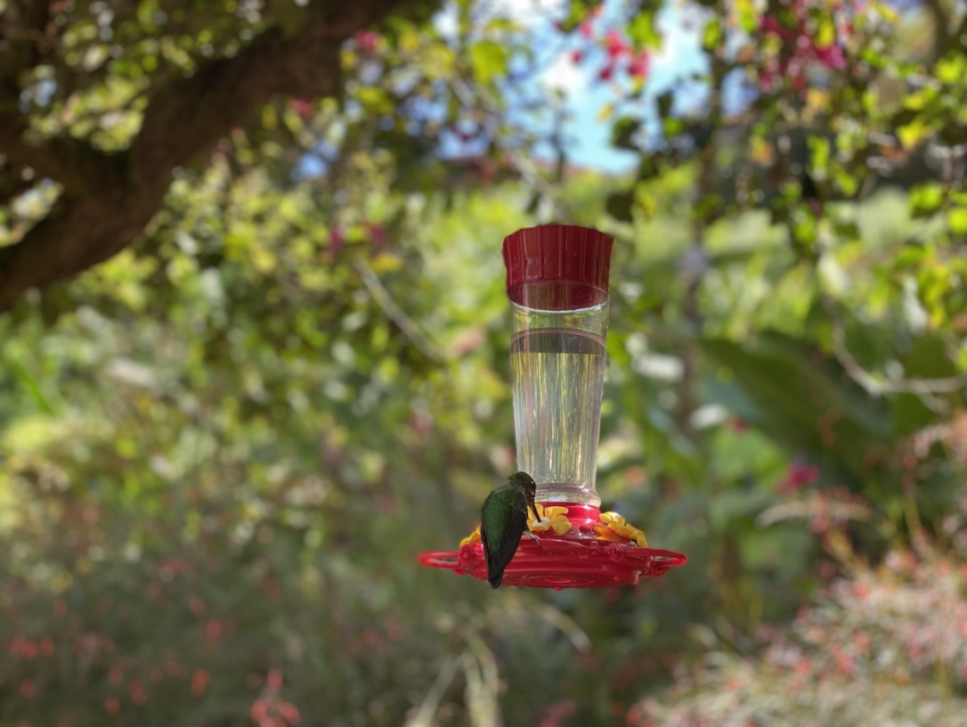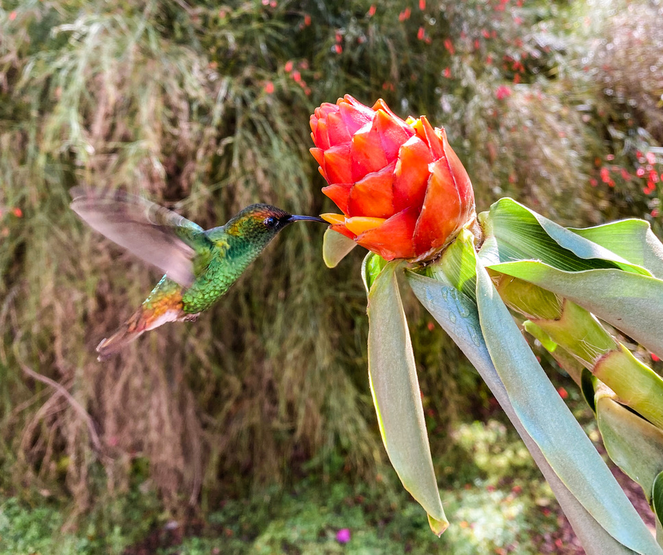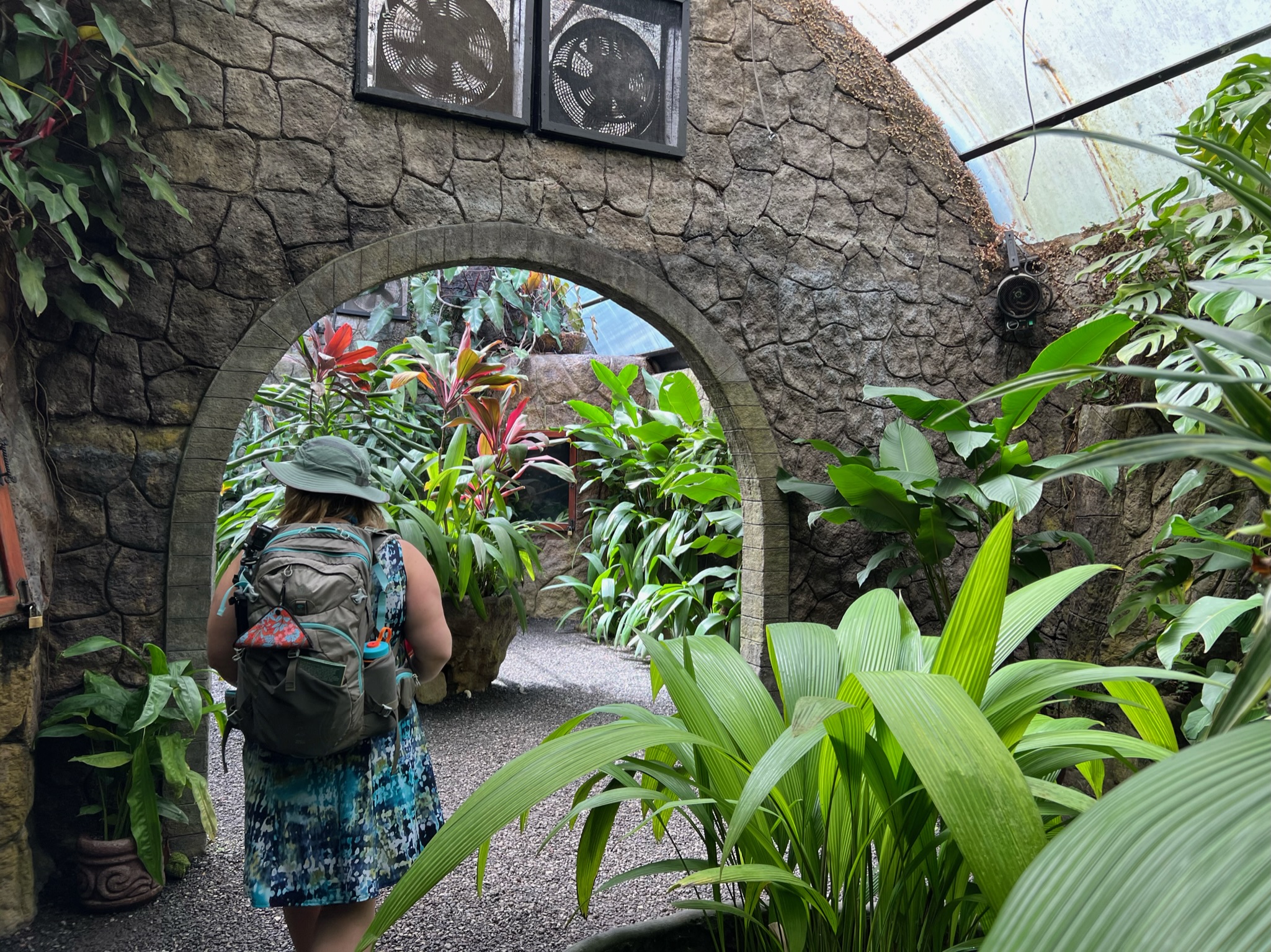 After the herpetology lesson he offers to take us back to the hummingbird exhibit and “show us something special.” He pours some of the feeder nectar onto a large, beautiful flower and the birds swarm to it, creating a fantastic photo opportunity for Slow and I to get up close and personal with the tiny creatures and see them in more detail. They are buzzing so quickly that many almost collide with us. John takes several photos and videos for us before we head off to see the jungle cats.