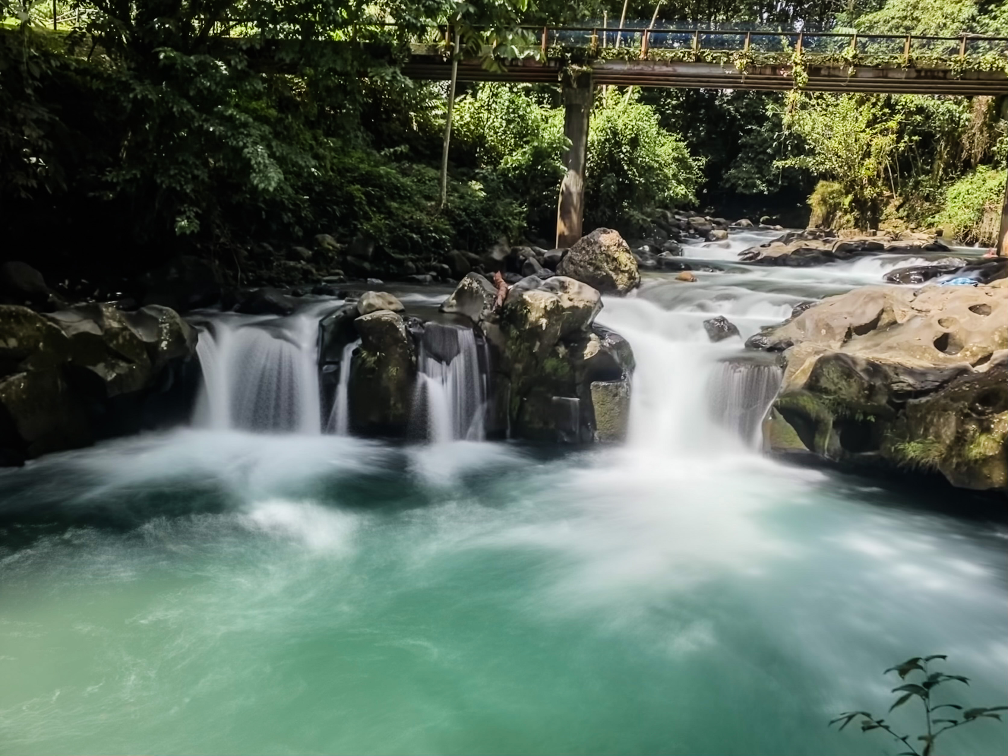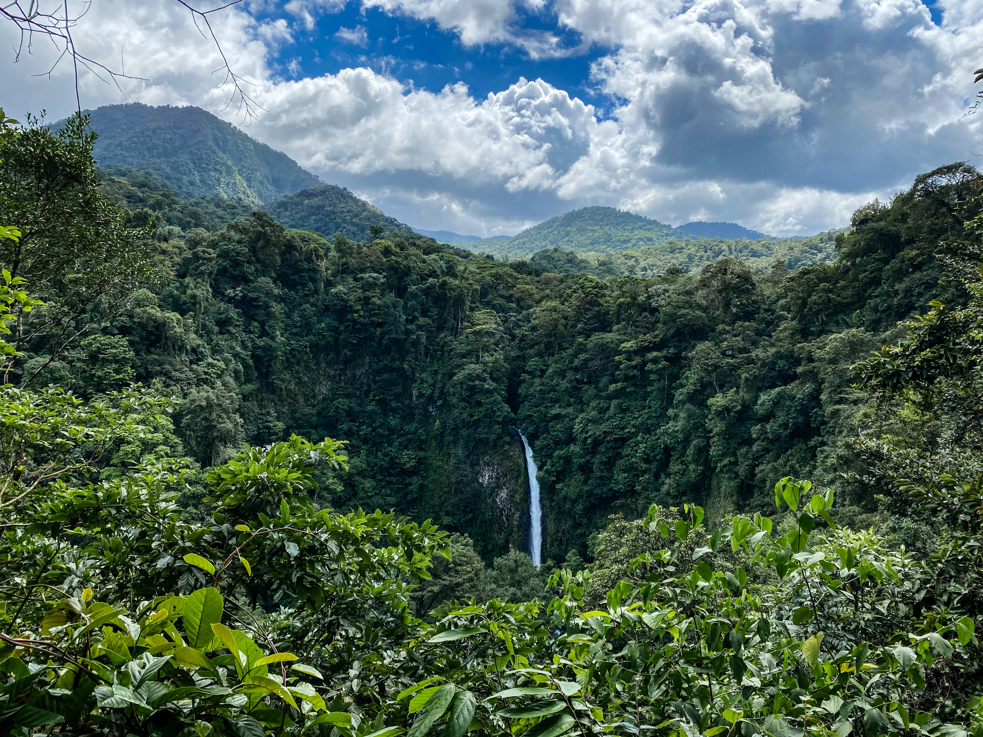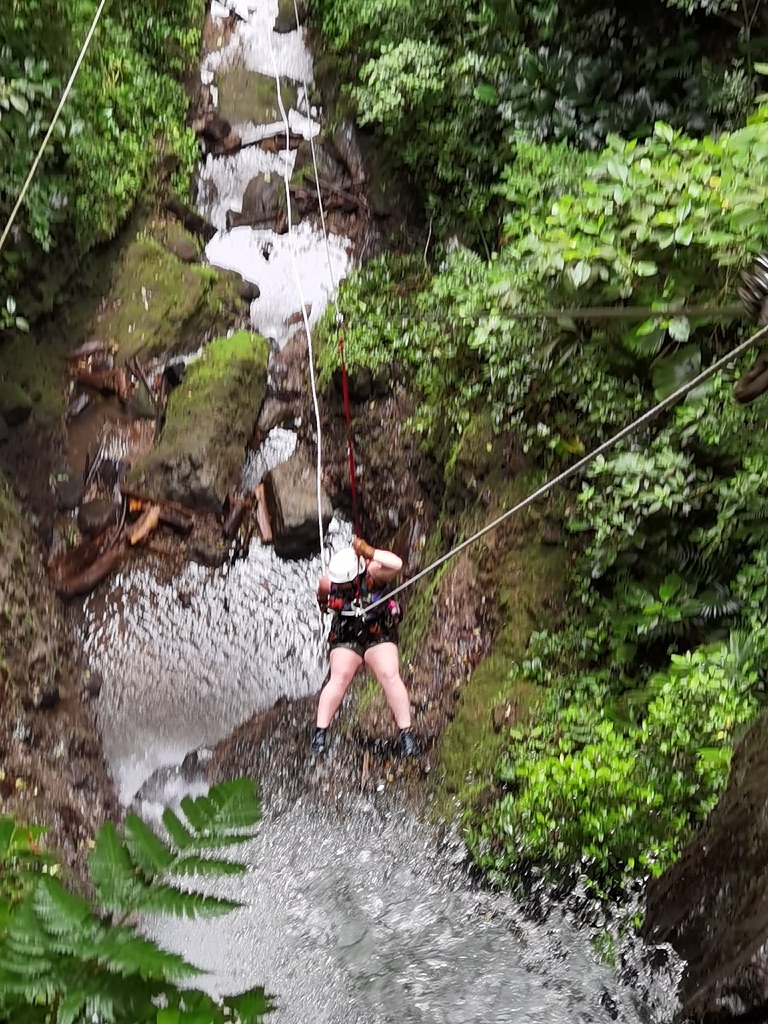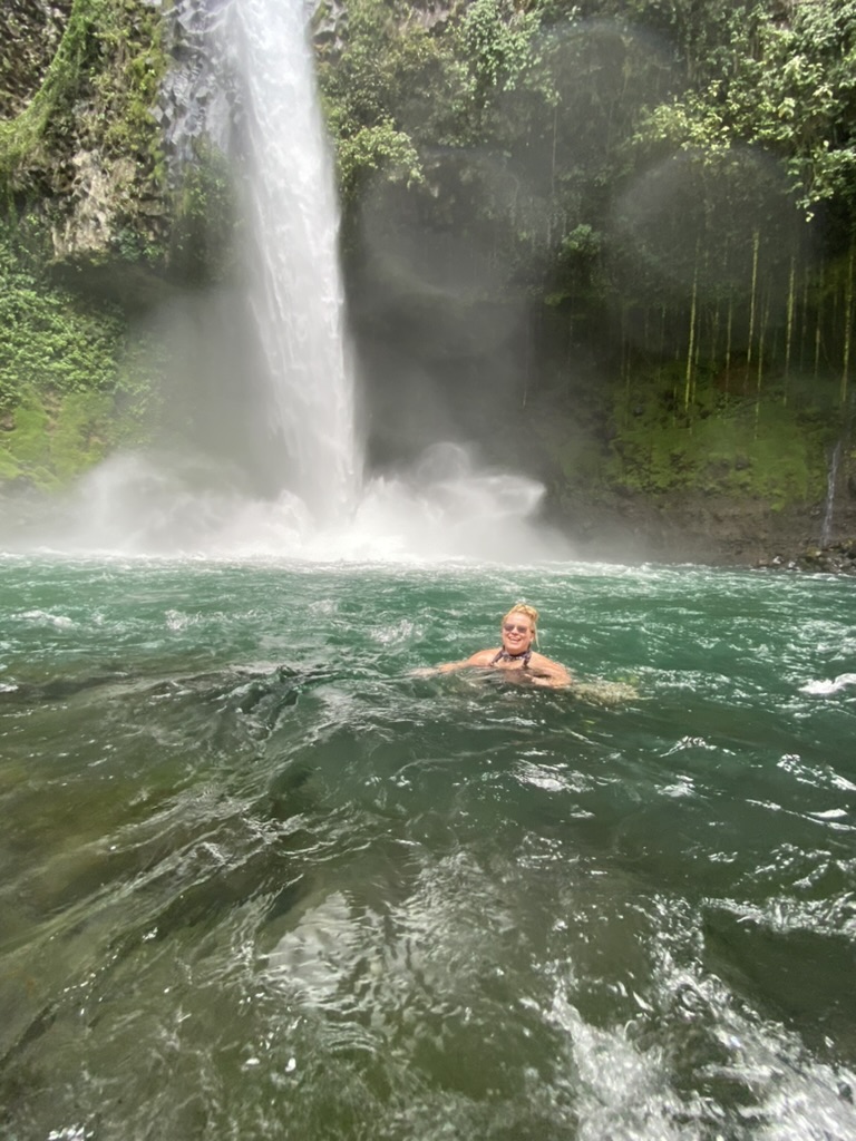 Once we are beyond the final rappel, we have a creek-walk and then a 250-300ft climb to get back out of the canyon. I could have stayed in this creek all day and am sad to see the activity come to an end, but I’m ready for lunch! Desafio serves us lunch back at their base, and afterward Catalina takes us to a “secret local swimming hole” below the el Salto waterfall on the Rio Fortuna, where several members of our group take a jump into the clear blue water. Afterward, we are off to the next adventure: La Fortuna Waterfall.