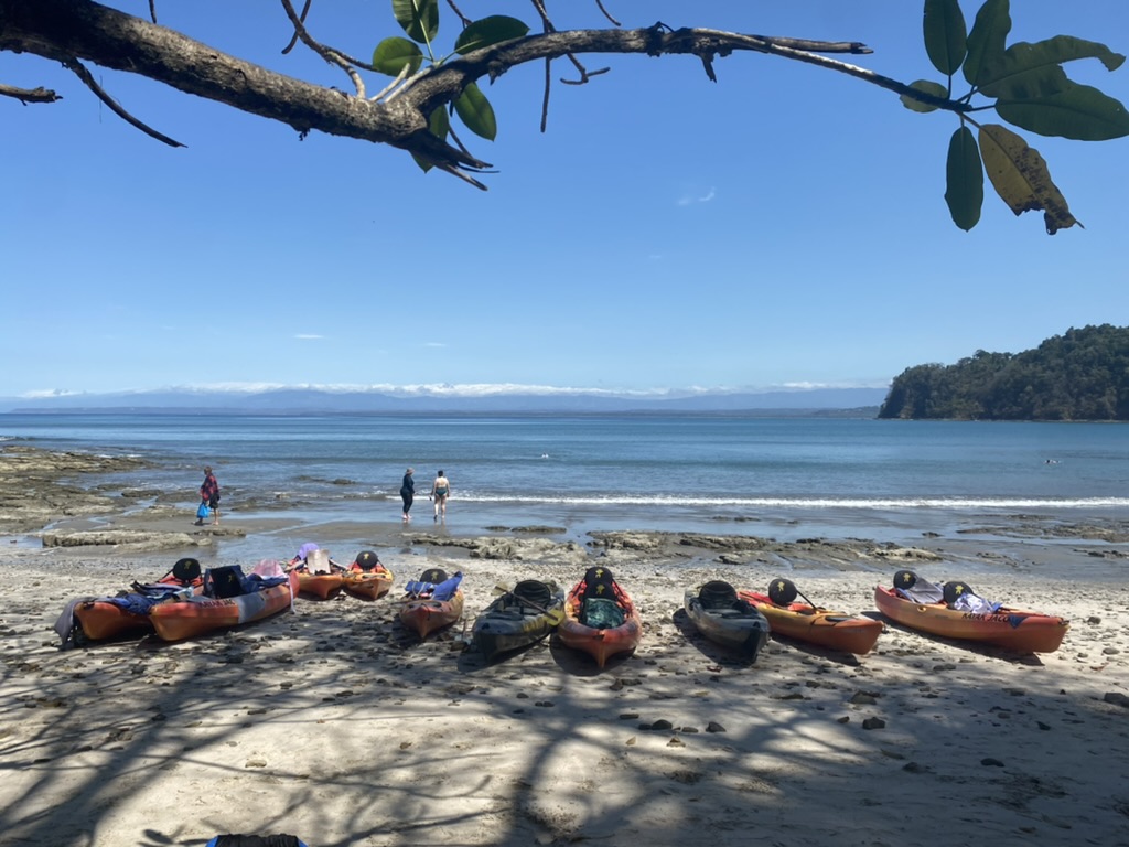 Today is all about the sea: we will be sea kayaking, having lunch on the beach, snorkeling in a coral reef, and then have individual beach time in the evening. We leave the hotel at 0800 and head out of Jaco, down a dirt road to a little kayaking outpost close to the beach called “Kayak Jaco”. This operation is small but very professional. We are outfitted with PFD’s and paddles and we walk the short distance to the ocean to put in our kayaks. The weather is gorgeous and hot, and we are all excited to be on the water.