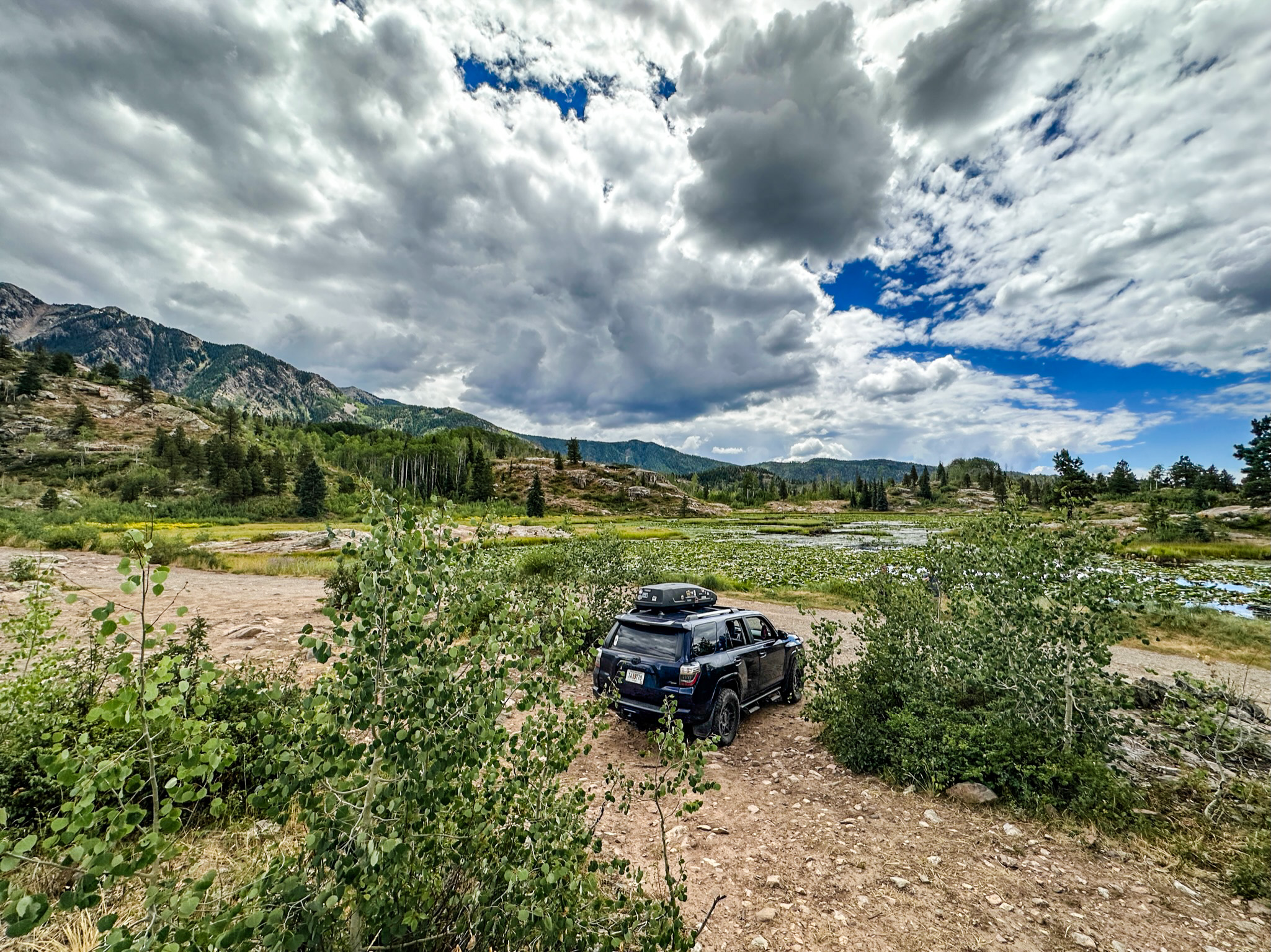 I sat in the sun and dried off as another family of several people and a Labrador debated whether or not they would also go for a swim. Everyone except the Lab decided against it. Once I’d dried off we began the steep ascent back to the car, where we would continue on Lime Creek Road to a small pond. We pass the trailhead to Spud Lake and I make a mental note to return someday and make that hike. Today is not the day, however, as a storm cloud is rolling in. We stop for a few more photo ops and then make the drive back to Matthew’s cabin, where afternoon naps are in order. I feel a little guilty because we didn’t do much today, but Levon and I are truly exhausted from the long drive, and Matthew is equally wiped out from several long shifts at work, so a relaxed evening is just what we all needed.