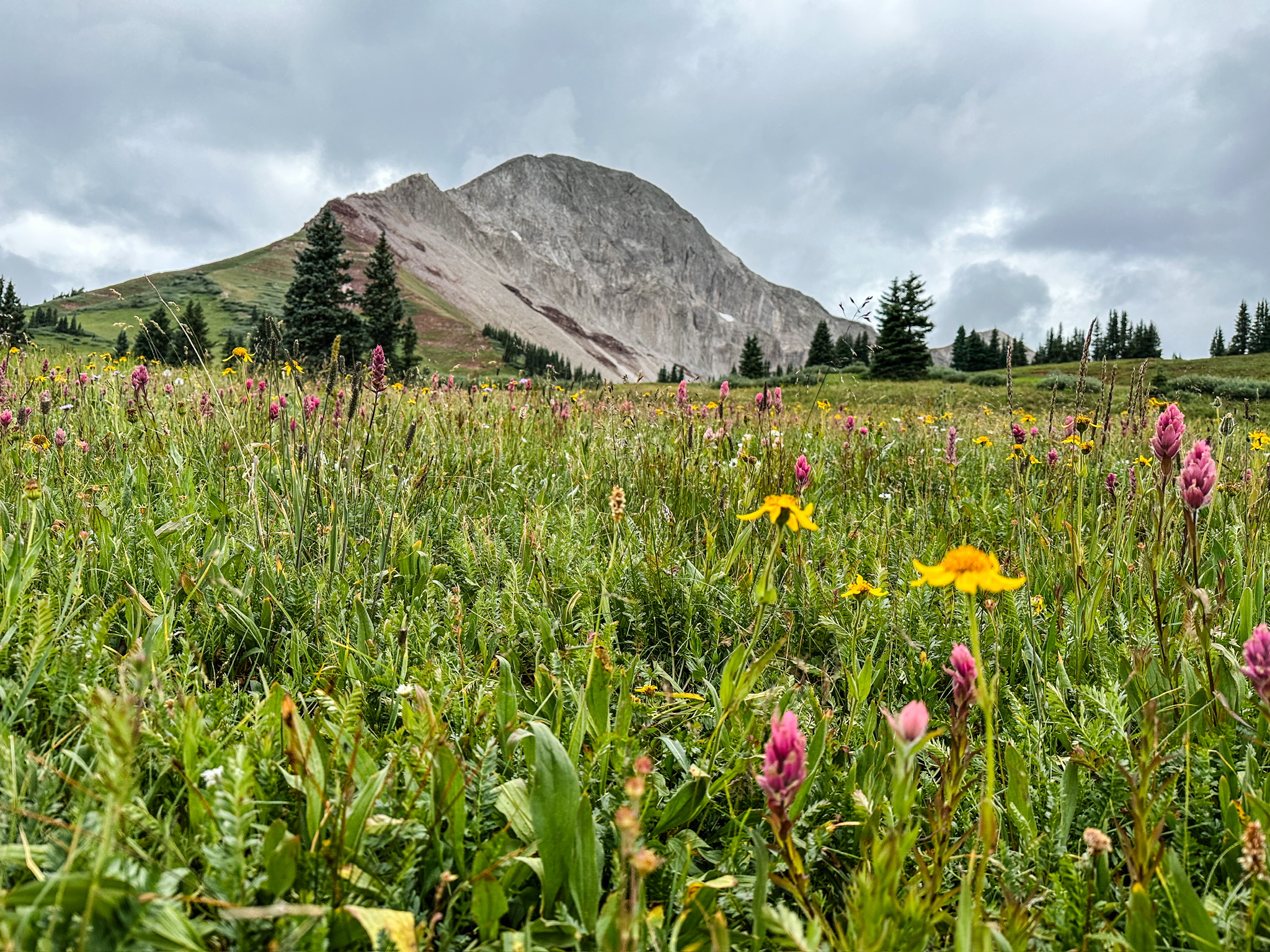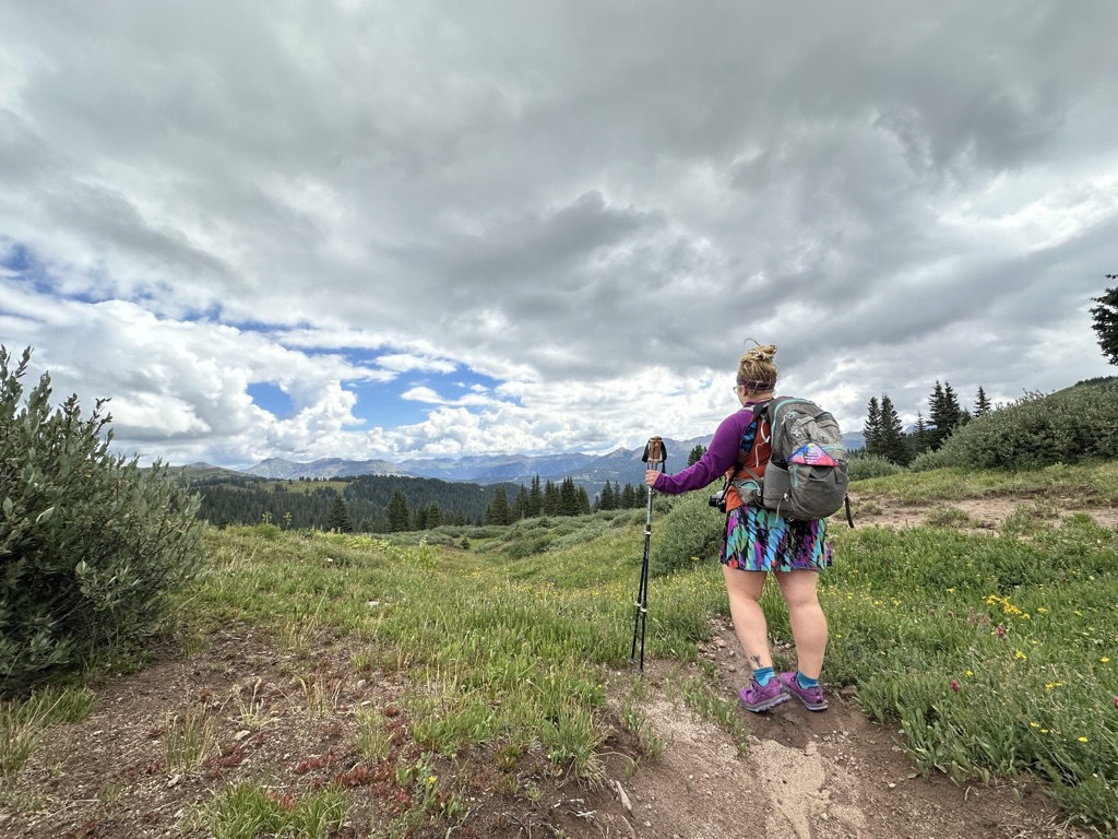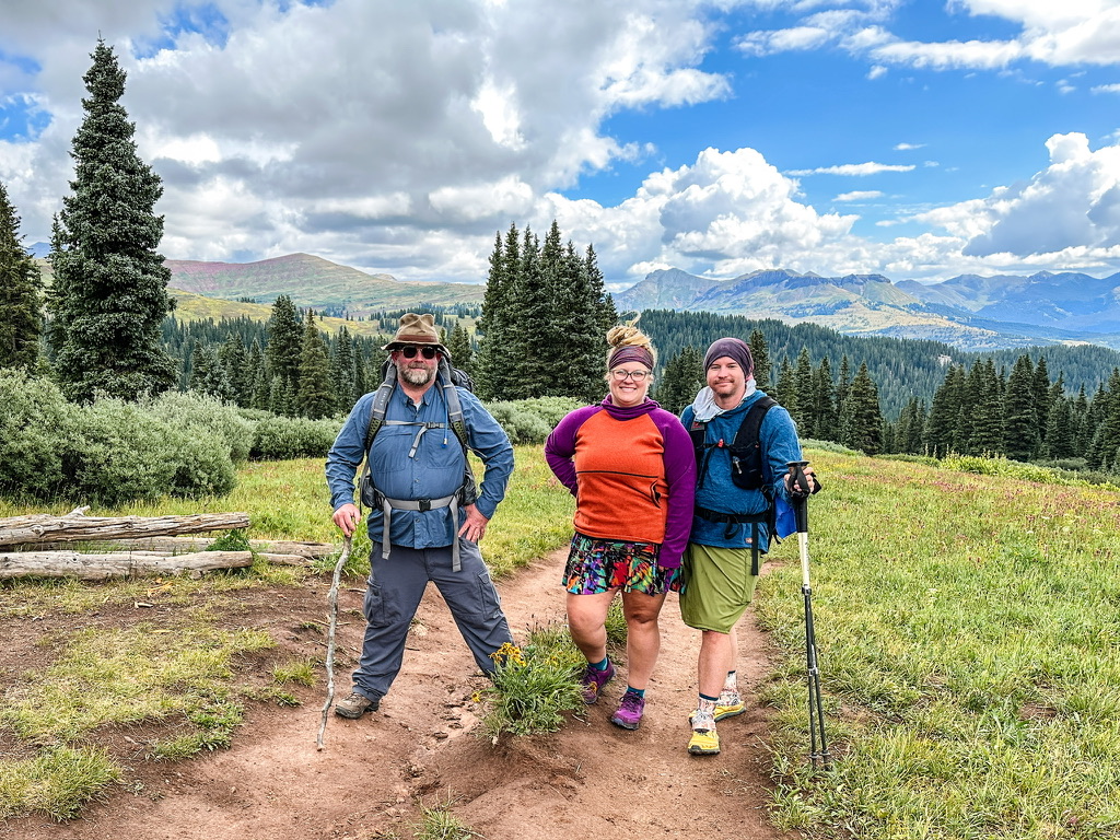 As we wound up through the woods the terrain changed from forest to alpine tundra, and the summit of Engineer Mountain came into view. At the base of the final ascent to the summit, we stopped for a snack break and weighed our options. The summit of Engineer Mountain was flanked by storm clouds, and as we ate it became shrouded in a dense, low-lying cloud and we could see heat lightened sparkling in the haze. We made the decision to continue around the loop we’d planned and skip the summit to beat the storms. This turned out to be a good call. The clouds continued to darken as they fully engulfed the peak of Engineer Mountain and began to descend down the slopes toward the plain we were traversing.