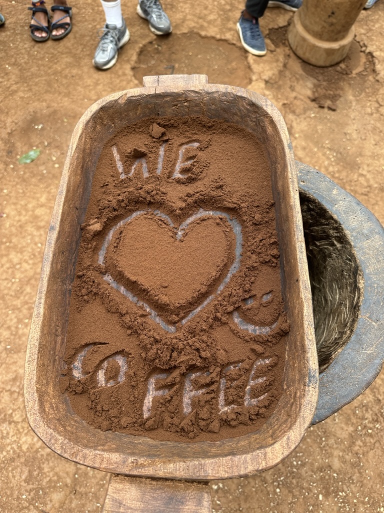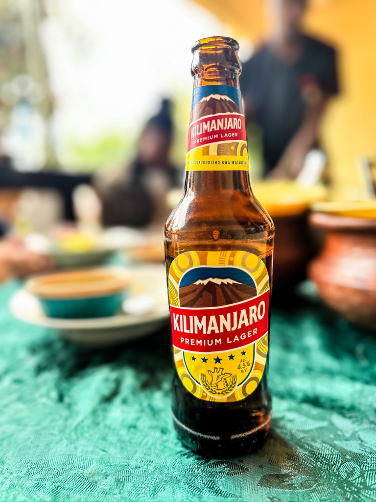 After drying off and changing, we hike back to our vehicle, stopping to purchase some souvenirs from local vendors set up along the trail. Afterward, we head to the coffee farm for lunch. As we eat, Albert reminds us of a joke he made on the trail earlier: if anyone fell, they owed the group a round of beers. Well, at the waterfall, he wiped out hard—so hard he cut his hand open on a rock, and I ended up stepping into nurse mode and bandaging it for him. True to his word, he makes good on the deal, bringing four Kilimanjaro Lagers to the table. I’m not usually much of a beer drinker, but I wanted to try the local brew. It’s refreshing, a little spicy, and honestly, pretty good.